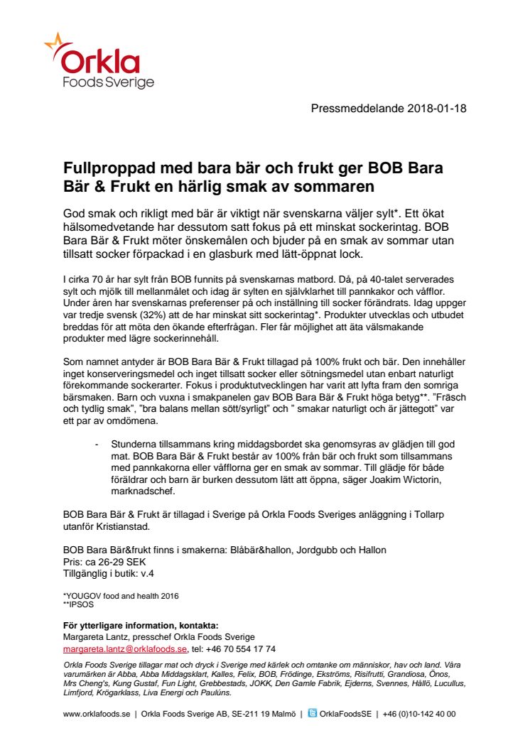 God smak och rikligt med bär är viktigt när svenskarna väljer sylt*. Ett ökat hälsomedvetande har dessutom satt fokus på ett minskat sockerintag. BOB Bara Bär & Frukt möter önskemålen och bjuder på en smak av sommar utan tillsatt socker förpackad i en glasburk med lättöppnat lock.