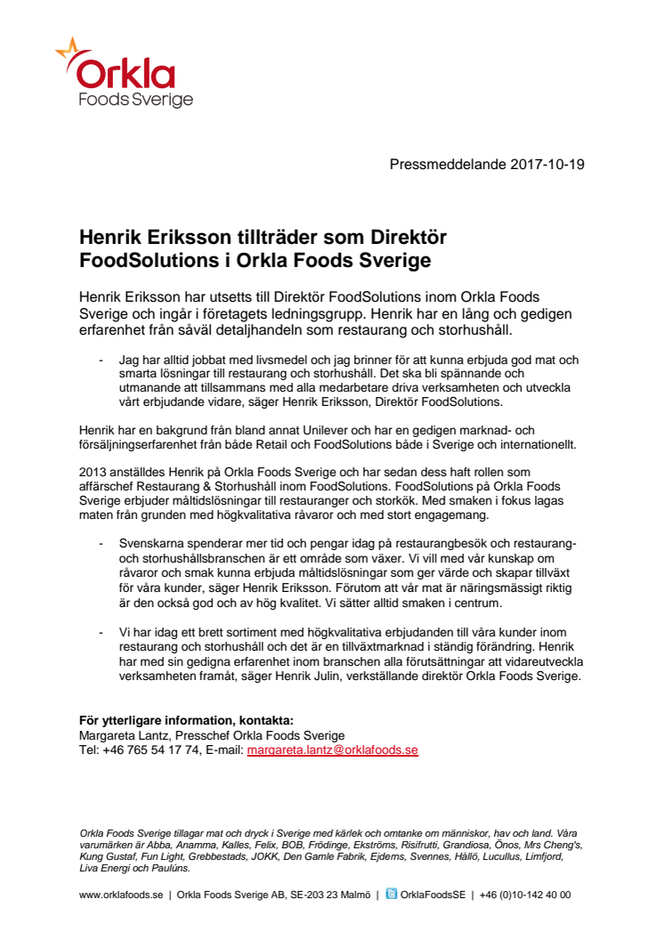 Henrik Eriksson har utsetts till Direktör FoodSolutions inom Orkla Foods Sverige och ingår i företagets ledningsgrupp.