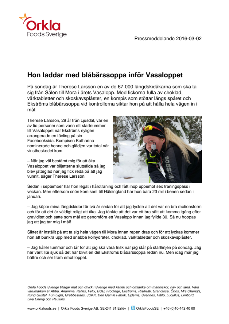 På söndag är Therese Larsson en av de 67 000 längdskidåkarna som ska ta sig från Sälen till Mora i årets Vasalopp. Med fickorna fulla av choklad, värktabletter och skoskavsplåster, en kompis som stöttar längs spåret och Ekströms blåbärssoppa vid kontrollerna siktar hon på att hålla hela vägen in i mål.