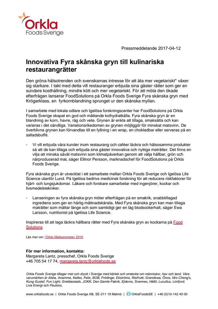 Den gröna hälsotrenden och svenskarnas intresse för att äta mer vegetariskt* växer sig starkare. I takt med detta vill restauranger erbjuda sina gäster rätter som ger en sundare kosthållning, mindre kött och mer vegetariskt. För att möta den ökade efterfrågan lanserar FoodSolutions på Orkla Foods Sverige Fyra skånska gryn med Krögarklass, en fyrkornblandning sprunget ur den skånska myllan.