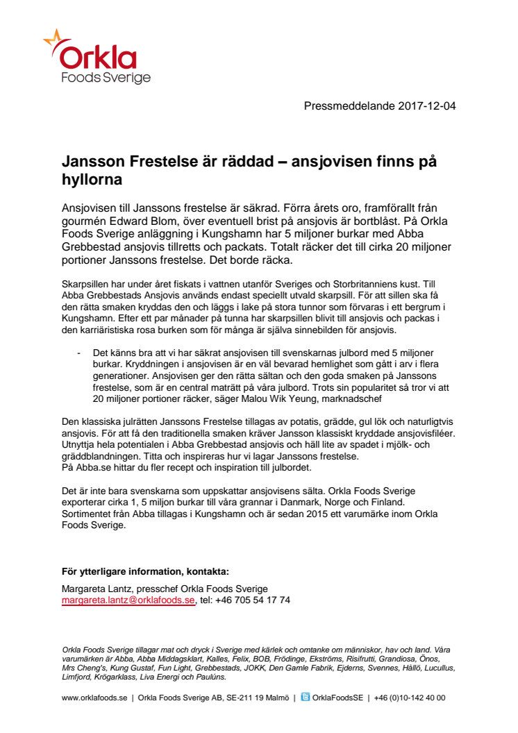 Ansjovisen till Janssons frestelse är säkrad. Förra årets oro, framförallt från gourmén Edward Blom, över eventuell brist på ansjovis är bortblåst. På Orkla Foods Sverige anläggning i Kungshamn har 5 miljoner burkar med Abba Grebbestad ansjovis tillretts och packats. Totalt räcker det till cirka 20 miljoner portioner Janssons frestelse. Det borde räcka.