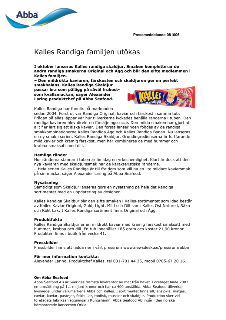– Den mildrökta kaviaren, färskosten och skaldjuren ger en perfekt smakbalans. Kalles Randiga Skaldjur passar bra som pålägg på såväl frukost- som kvällsmackan, säger Alexander Laring produktchef på Abba Seafood.