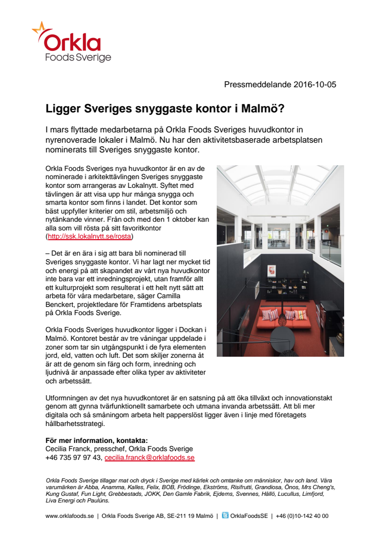 I mars flyttade medarbetarna på Orkla Foods Sveriges huvudkontor in nyrenoverade lokaler i Malmö. Nu har den aktivitetsbaserade arbetsplatsen nominerats till Sveriges snyggaste kontor.