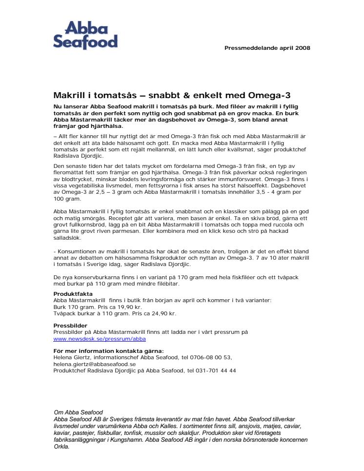 Nu lanserar Abba Seafood makrill i tomatsås på burk. Med filéer av makrill i fyllig tomatsås är den perfekt som nyttig och god snabbmat på en grov macka. En burk Abba Mästarmakrill täcker mer än dagsbehovet av Omega-3, som bland annat främjar god hjärthälsa.