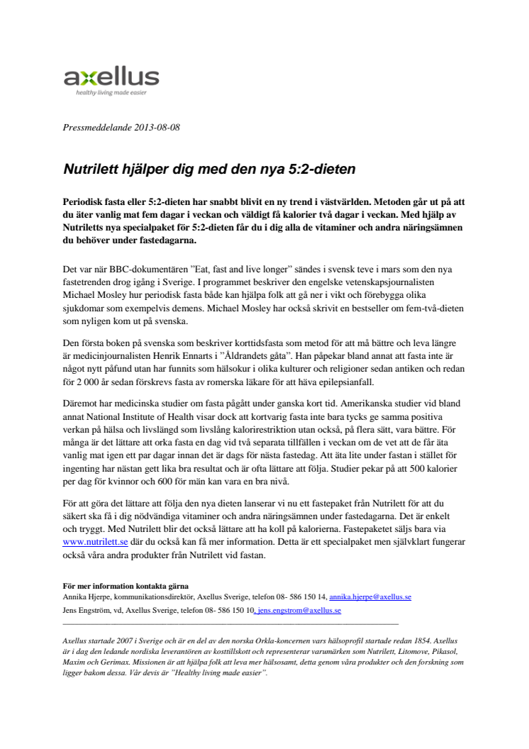 Periodisk fasta eller 5:2-dieten har snabbt blivit en ny trend i västvärlden. Metoden går ut på att du äter vanlig mat fem dagar i veckan och väldigt få kalorier två dagar i veckan. Med hjälp av Nutriletts nya specialpaket för 5:2-dieten får du i dig alla de vitaminer och andra näringsämnen du behöver under fastedagarna.