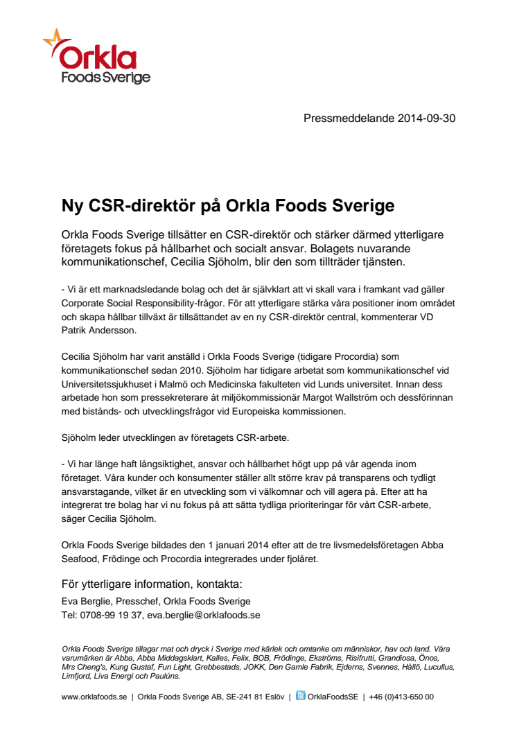 Orkla Foods Sverige tillsätter en CSR-direktör och stärker därmed ytterligare företagets fokus på hållbarhet och socialt ansvar. Bolagets nuvarande kommunikationschef, Cecilia Sjöholm, blir den som tillträder tjänsten.
