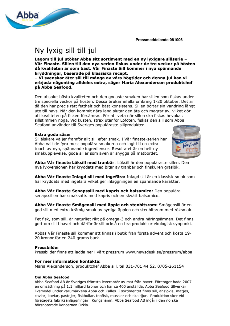 Lagom till jul utökar Abba sitt sortiment med en ny lyxigare sillserie – Vår Finaste. Sillen till den nya serien fiskas under de tre veckor på hösten då kvaliteten är som bäst. Vår Finaste Sill kommer i nya spännande kryddningar, baserade på klassiska recept.