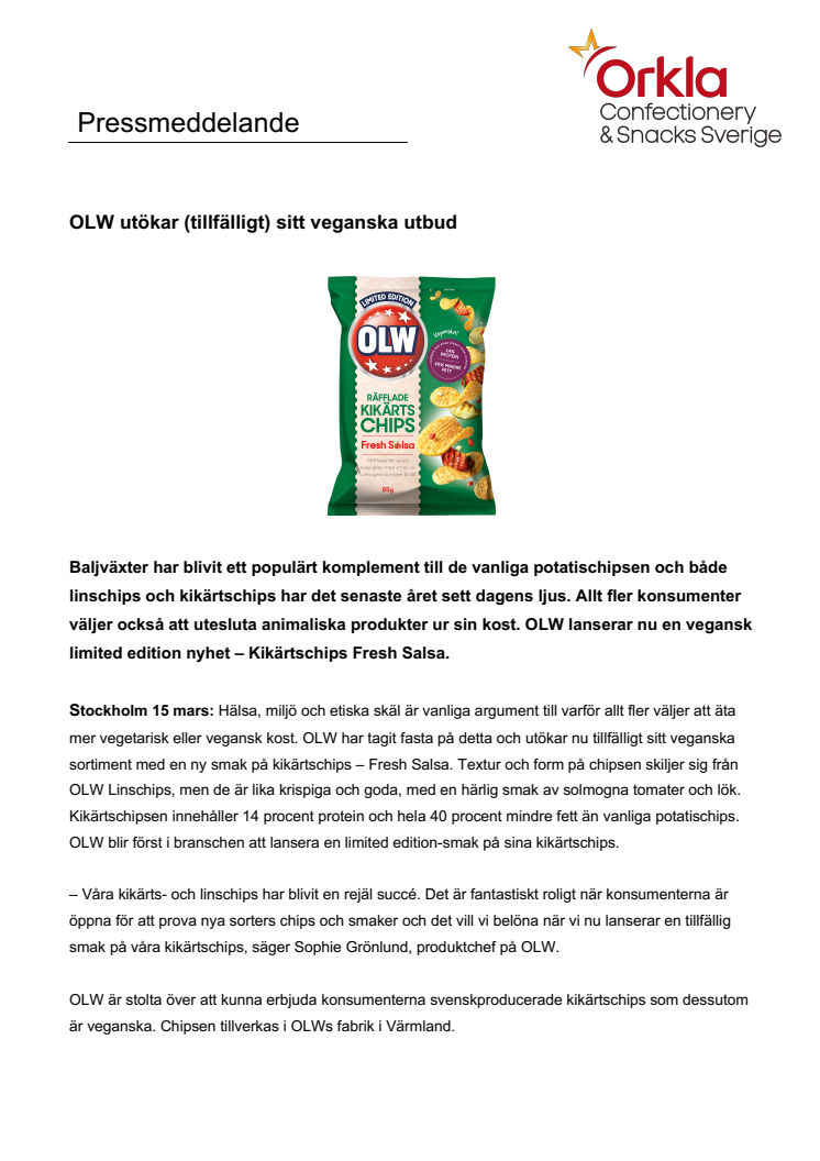Baljväxter har blivit ett populärt komplement till de vanliga potatischipsen och både linschips och kikärtschips har det senaste året sett dagens ljus. Allt fler konsumenter väljer också att utesluta animaliska produkter ur sin kost. OLW lanserar nu en vegansk limited edition nyhet – Kikärtschips Fresh Salsa.