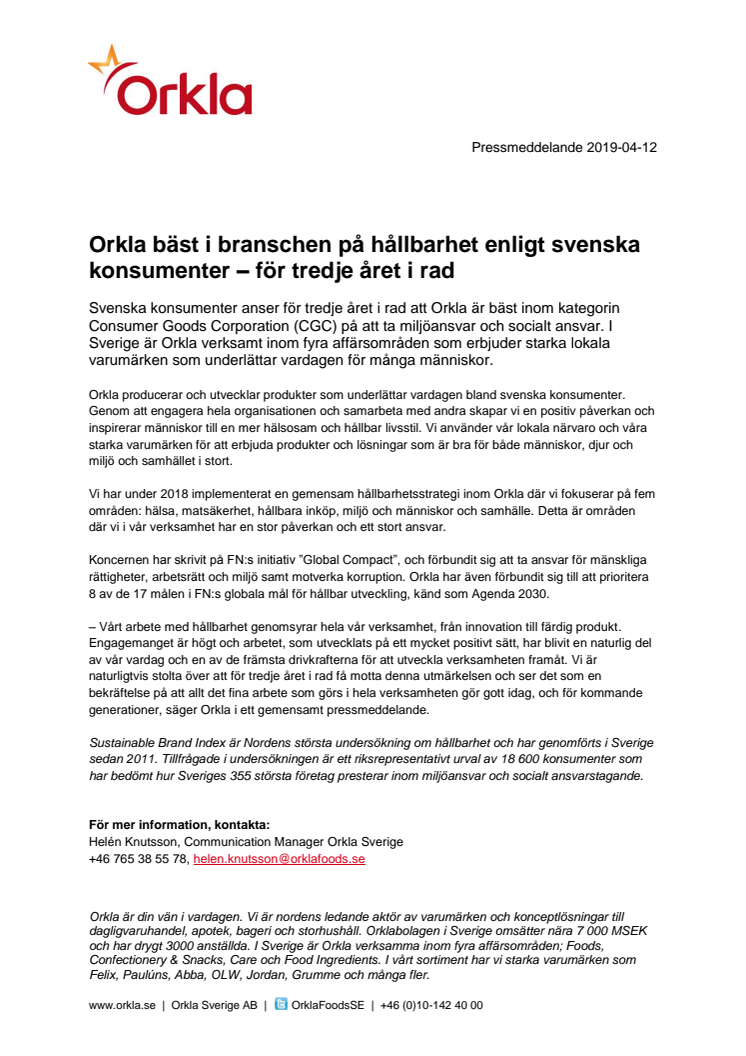 Svenska konsumenter anser för tredje året i rad att Orkla är bäst inom kategorin Consumer Goods Corporation (CGC) på att ta miljöansvar och socialt ansvar. I Sverige är Orkla verksamt inom fyra affärsområden som erbjuder starka lokala varumärken som underlättar vardagen för många människor.