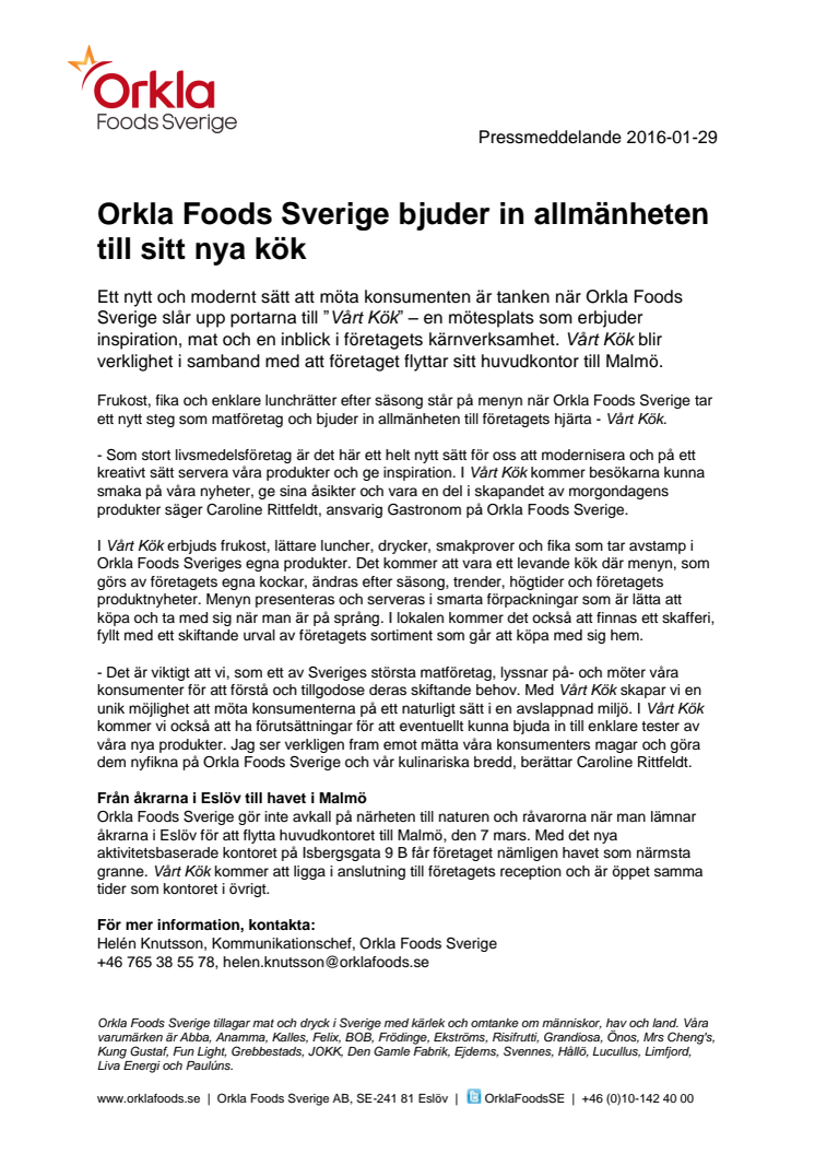 Ett nytt och modernt sätt att möta konsumenten är tanken när Orkla Foods Sverige slår upp portarna till ”Vårt Kök” – en mötesplats som erbjuder inspiration, mat och en inblick i företagets kärnverksamhet. Vårt Kök blir verklighet i samband med att företaget flyttar sitt huvudkontor till Malmö.
