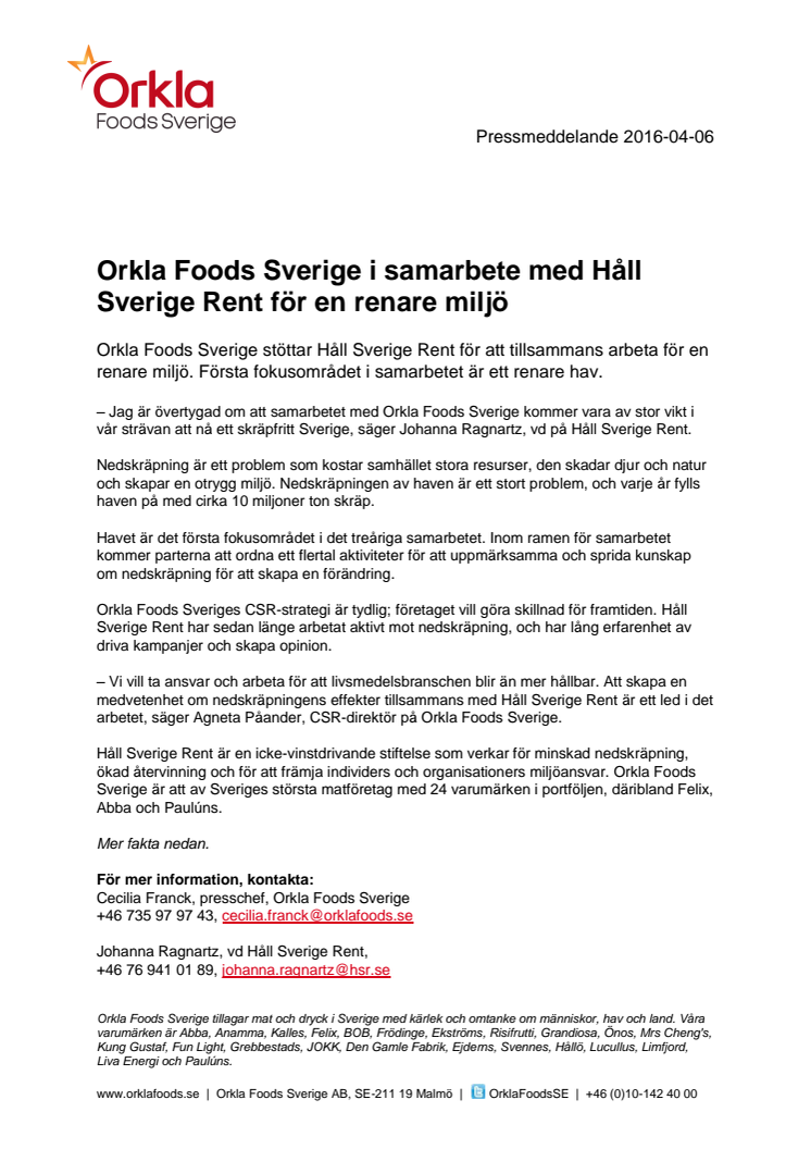 Orkla Foods Sverige stöttar Håll Sverige Rent för att tillsammans arbeta för en renare miljö. Första fokusområdet i samarbetet är ett renare hav.