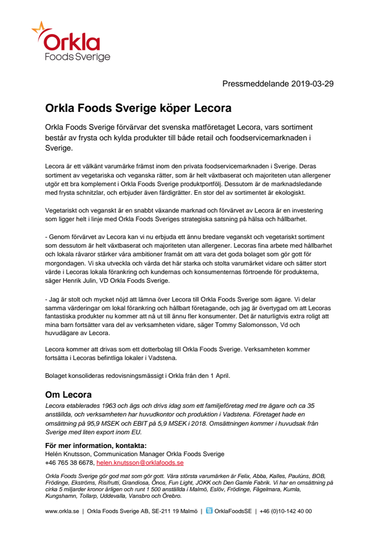 Orkla Foods Sverige förvärvar det svenska matföretaget Lecora, vars sortiment består av frysta och kylda produkter till både retail och foodservicemarknaden i Sverige.