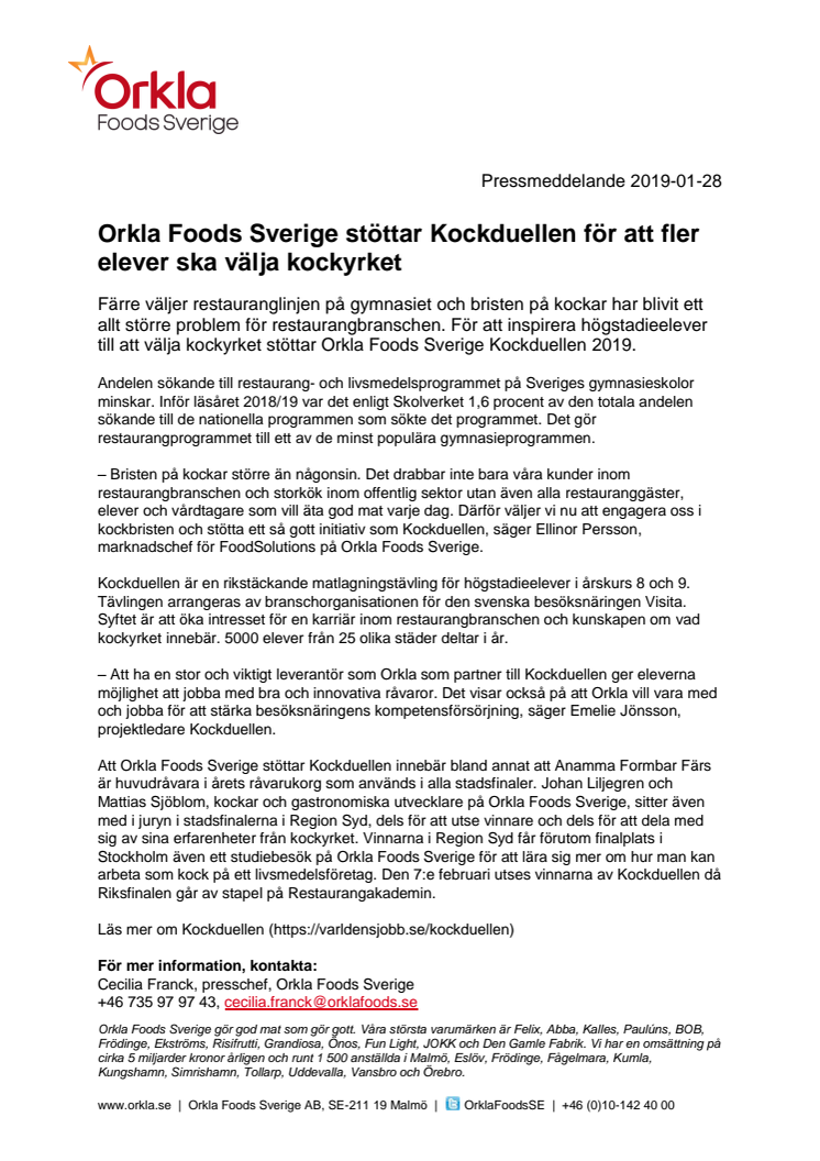 Färre väljer restauranglinjen på gymnasiet och bristen på kockar har blivit ett allt större problem för restaurangbranschen. För att inspirera högstadieelever till att välja kockyrket stöttar Orkla Foods Sverige Kockduellen 2019.