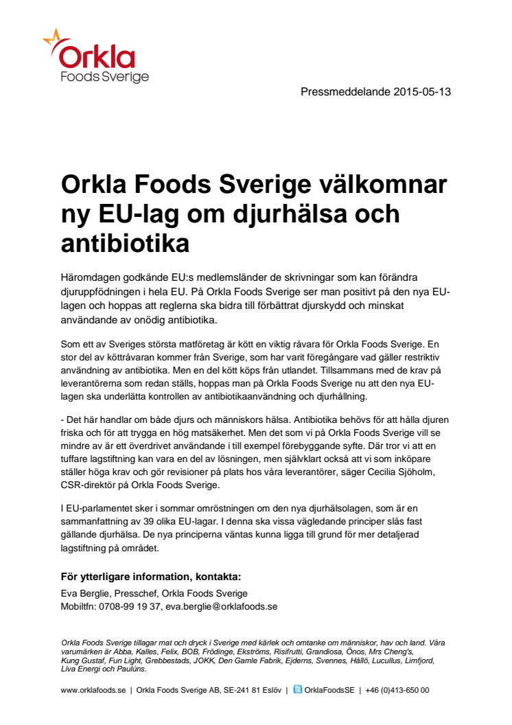 Orkla Foods Sverige välkomnar ny EU-lag om djurhälsa och antibiotika