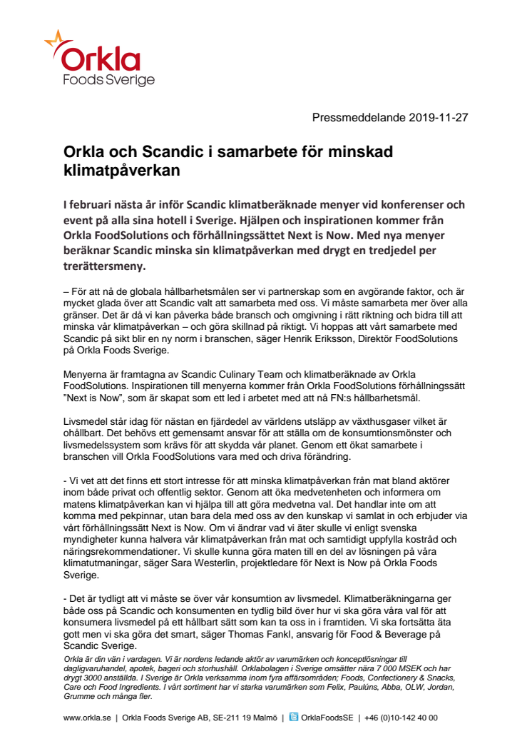 I februari nästa år inför Scandic klimatberäknade menyer vid konferenser och event på alla sina hotell i Sverige. Hjälpen och inspirationen kommer från Orkla FoodSolutions och förhållningssättet Next is Now. Med nya menyer beräknar Scandic minska sin klimatpåverkan med drygt en tredjedel per trerättersmeny.