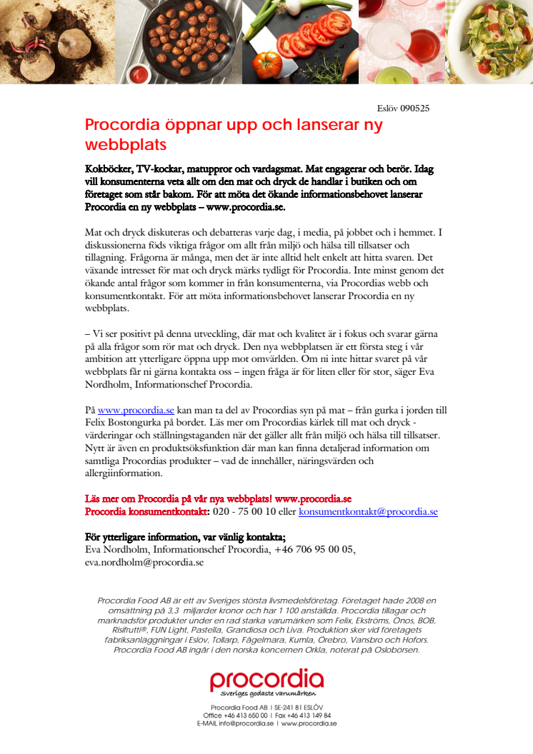 Kokböcker, TV-kockar, matuppror och vardagsmat. Mat engagerar och berör. Idag vill konsumenterna veta allt om den mat och dryck de handlar i butiken och om företaget som står bakom. För att möta det ökande informationsbehovet lanserar Procordia en ny webbplats – www.procordia.se.