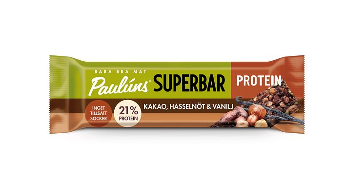 Paulúns Superbar Protein i smaken Kakao, Hasselnöt & vanilj