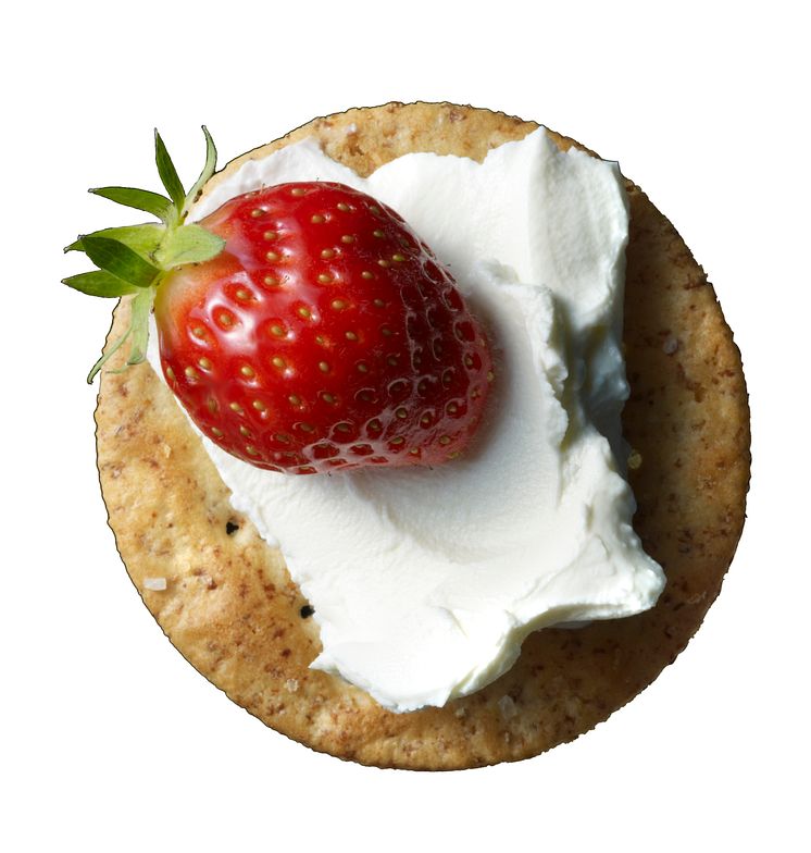 Salinas med en frisk naturell färskost toppad med en jordgubbe och balsamicokräm.