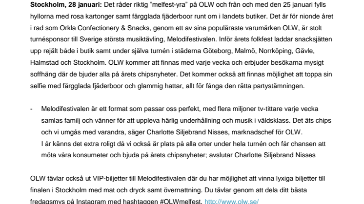 Stockholm, 28 januari: Det råder riktig ”melfest-yra” på OLW och från och med den 25 januari fylls hyllorna med rosa kartonger samt färgglada fjäderboor runt om i landets butiker. Det är för nionde året i rad som Orkla Confectionery & Snacks, genom ett av sina populäraste varumärken OLW, är stolt turnésponsor till Sverige största musiktävling, Melodifestivalen. Inför årets folkfest laddar snacksjätten upp rejält både i butik samt under själva turnén i städerna Göteborg, Malmö, Norrköping, Gävle, Halmstad och Stockholm. OLW kommer att finnas med varje vecka och erbjuder besökarna mysigt soffhäng där de bjuder alla på årets chipsnyheter. Det kommer också att finnas möjlighet att toppa sin selfie med färgglada fjäderboor och glammig hattar, allt för fånga den rätta partystämningen.