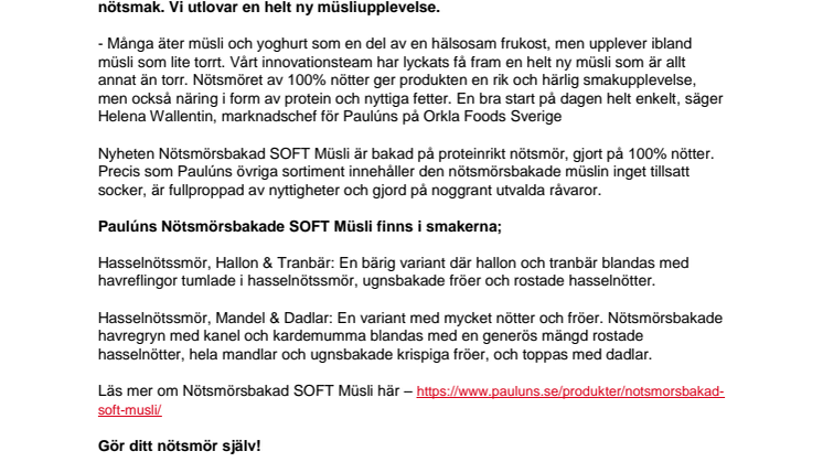 - Många äter müsli och yoghurt som en del av en hälsosam frukost, men upplever ibland müsli som lite torrt. Vårt innovationsteam har lyckats få fram en helt ny müsli som är allt annat än torr. Nötsmöret av 100% nötter ger produkten en rik och härlig smakupplevelse, men också näring i form av protein och nyttiga fetter. En bra start på dagen helt enkelt, säger Helena Wallentin, marknadschef för Paulúns på Orkla Foods Sverige