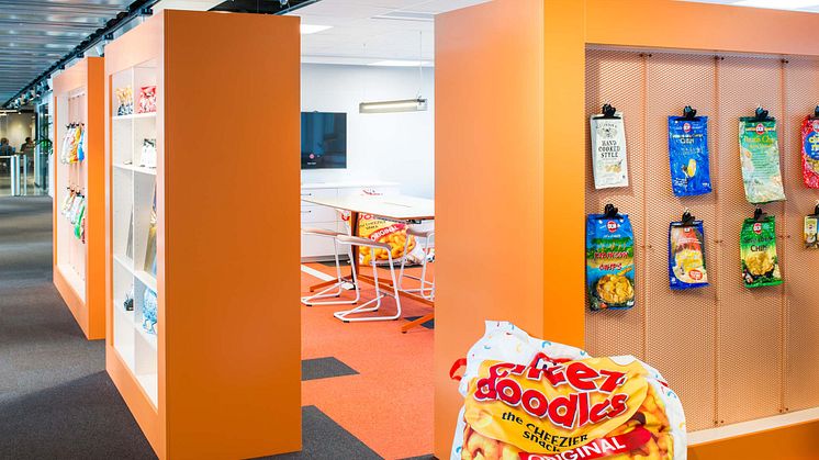 Orklas kontor på Svetsarvägen i Solna Business Park är ett snyggt och välvårdat kontor som har mer än bara yta. Orkla har skapat en mötesplats för fyra bolag där du redan i entrén möts av alla varumärken, allt från små plåsterförpackningar till ostbågspåsar i party size.