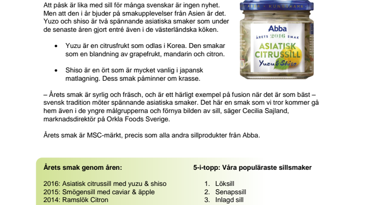 Under påskveckan äter vi svenskar drygt 700 ton sill. Lagom till en av våra största sillhögtider presenteras nu Årets smak från Abba – asiatisk citrussill med yuzu & shiso.