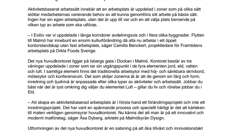 För drygt en månad sedan byttes närheten till bördiga åkrar ut mot böljande vågor då Orkla Foods Sverige flyttade sitt huvudkontor från Eslöv till Malmö. Flytten har inte bara inneburit att drygt 250 medarbetare fått en ny arbetsplats, utan samtidigt har också ett helt nytt aktivitetsbaserat arbetssätt introducerats.