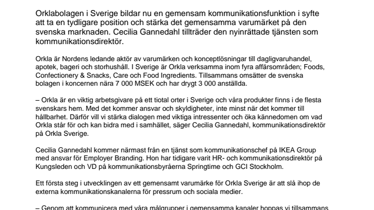 Orklabolagen i Sverige bildar nu en gemensam kommunikationsfunktion i syfte att ta en tydligare position och stärka det gemensamma varumärket på den svenska marknaden. Cecilia Gannedahl tillträder den nyinrättade tjänsten som kommunikationsdirektör.