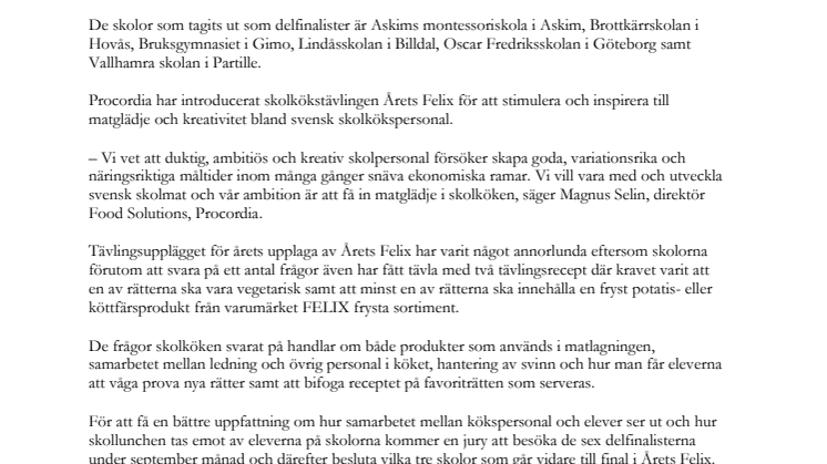 Procordia har introducerat skolkökstävlingen Årets Felix för att stimulera och inspirera till matglädje och kreativitet bland svensk skolkökspersonal.