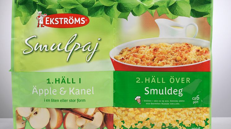 Nu är snart kladdiga fingrar ett minne blott - Ekströms lanserar ett färdigt kit för dej som snabbt och enkelt vill baka en smaskig smulpaj. Ekströms nya paj med klassiska pajsmaker som rabarber eller äpple/kanel gör det enklare än någonsin att bjuda på en snabb och god dessert. Nyheten finns i frysdisken och består av en duopåse med frukt eller bär i den ena fickan och klassisk smuldeg i den andra.