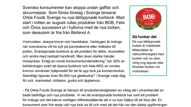 Svenska konsumenter kan stoppa undan gafflar och skruvmejslar. Som första företag i Sverige lanserar Orkla Foods Sverige nu nya lättöppnade burklock. Med start i mitten av augusti rullas produkter från BOB, Felix och Önos successivt ut i hyllorna med de nya locken, som dessutom är fria från Bisfenol A.