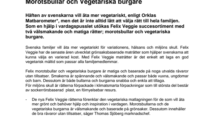 - De nya Felix Veggie rätterna förenklar den vegetariska matlagningen för de som vill äta mer grönt och behöver hjälp och inspiration i vardagen. Morotsbullarna och de vegetariska burgarna är välsmakande och baserade på grönsaker. Dessutom innehåller de bra råvaror utan tillsatser, säger Thomas Sjöberg marknadschef.