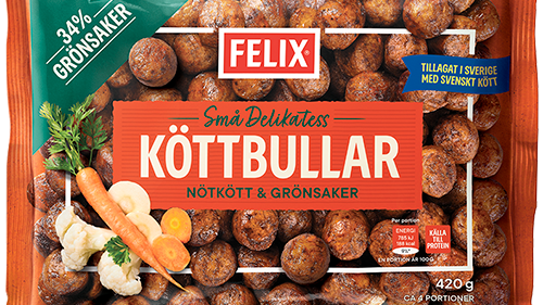 Orkla Foods Sverige introducerar nu en ny produkt i Felix-sortimentet: Små Delikatessköttbullar med nötkött och grönsaker. Den nya köttbullen är en hybridbulle med kryddning precis som originalet och med 34 % grönsaker; morot, blomkål, palsternacka och kikärta. Denna innovation kombinerar det bästa av två världar - en klassisk, välsmakande köttbulle med ett hälsosammare och mer hållbart innehåll. Köttbullen tillagas på Orkla Foods Sveriges anläggning i Eslöv med svenskt nötkött.