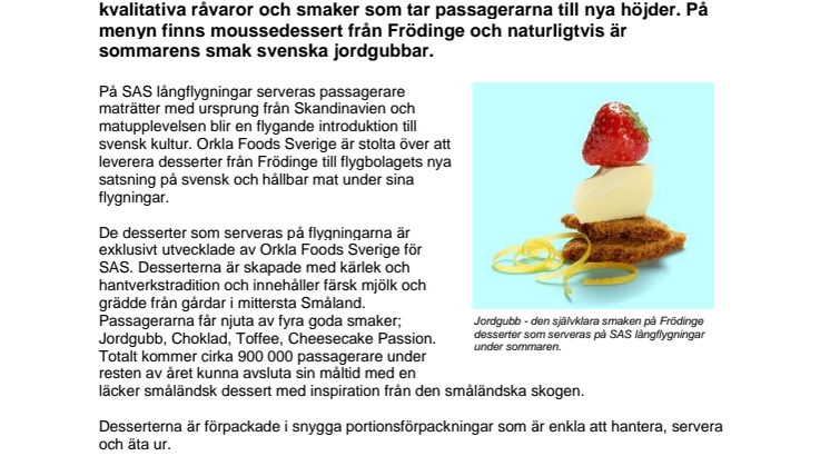 På SAS långflygningar serveras passagerare maträtter med ursprung från Skandinavien och matupplevelsen blir en flygande introduktion till svensk kultur. Orkla Foods Sverige är stolta över att leverera desserter från Frödinge till flygbolagets nya satsning på svensk och hållbar mat under sina flygningar.