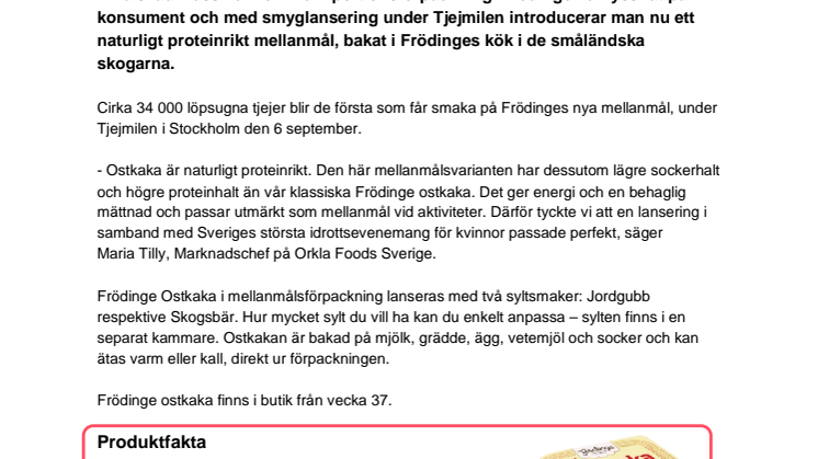 - Ostkaka är naturligt proteinrikt. Den här mellanmålsvarianten har dessutom lägre sockerhalt och högre proteinhalt än vår klassiska Frödinge ostkaka. Det ger energi och en behaglig mättnad och passar utmärkt som mellanmål vid aktiviteter. Därför tyckte vi att en lansering i samband med Sveriges största idrottsevenemang för kvinnor passade perfekt, säger Maria Tilly, Marknadschef på Orkla Foods Sverige.