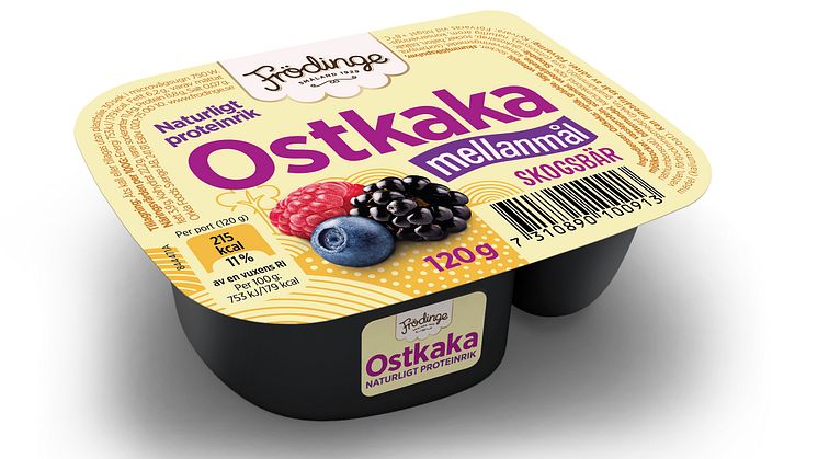 Frödinge Ostkaka i mellanmålsförpackning lanseras med två syltsmaker: Jordgubb respektive Skogsbär. Hur mycket sylt du vill ha kan du enkelt anpassa – sylten finns i en separat kammare. Ostkakan är bakad på mjölk, grädde, ägg, vetemjöl och socker och kan ätas varm eller kall, direkt ur förpackningen.