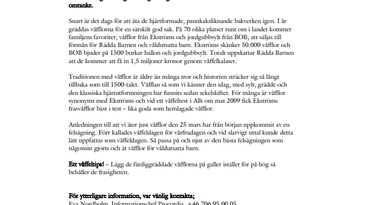 Snart är det dags för att äta de hjärtformade, pannkaksliknande bakverken igen. I år gräddas våfflorna för en särskilt god sak. På 70 olika platser runt om i landet kommer familjens favoriter, våfflor från Ekströms och jordgubbsylt från BOB, att säljas till förmån för Rädda Barnen och våldutsatta barn. Ekströms skänker 50.000 våfflor och BOB bjuder på 1500 burkar hallon och jordgubbsylt. Totalt uppskattar Rädda Barnen att de kommer att få in 1,5 miljoner kronor genom våffelkalaset.