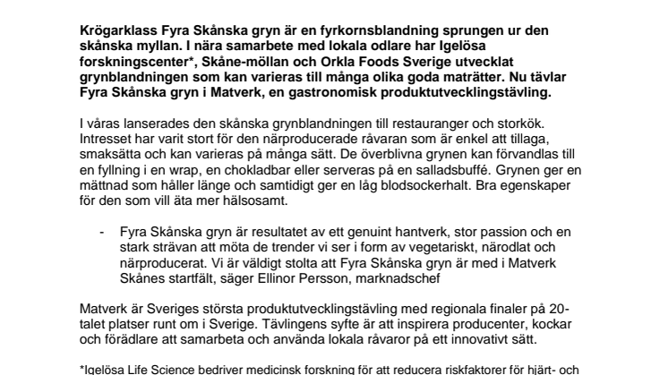 Krögarklass Fyra Skånska gryn är en fyrkornsblandning sprungen ur den skånska myllan. I nära samarbete med lokala odlare har Igelösa forskningscenter*, Skåne-möllan och Orkla Foods Sverige utvecklat grynblandningen som kan varieras till många olika goda maträtter. Nu tävlar Fyra Skånska gryn i Matverk, en gastronomisk produktutvecklingstävling.