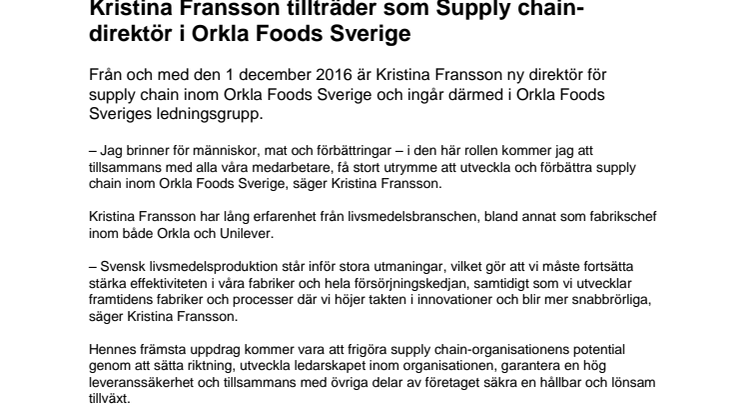 Från och med den 1 december 2016 är Kristina Fransson ny direktör för supply chain inom Orkla Foods Sverige och ingår därmed i Orkla Foods Sveriges ledningsgrupp.