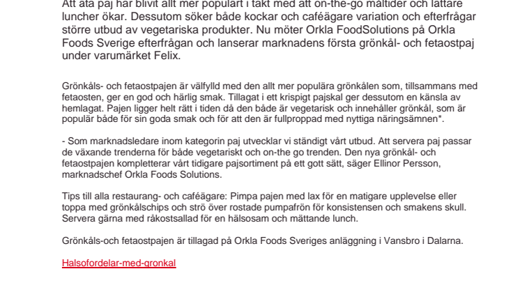 - Som marknadsledare inom kategorin paj utvecklar vi ständigt vårt utbud. Att servera paj passar de växande trenderna för både vegetariskt och on-the go trenden. Den nya grönkål- och fetaostpajen kompletterar vårt tidigare pajsortiment på ett gott sätt, säger Ellinor Persson, marknadschef Orkla Foods Solutions.