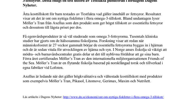 Axellus är ledande när det gäller högkvalitativa och vältestade kosttillskott med produkter som exempelvis Möller’s Tran, Pikasol, Litomove, Gerimax, Maxim och Nutrilett. Läs artikeln i Dagens Nyheter: http://www.dn.se/ekonomi/ont-om-nyttiga-fiskfetter-i-flera-omega-3-tillskott/