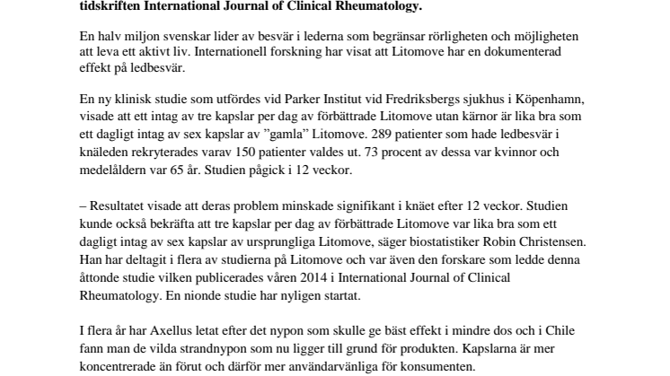 – Resultatet visade att deras problem minskade signifikant i knäet efter 12 veckor. Studien kunde också bekräfta att tre kapslar per dag av förbättrade Litomove var lika bra som ett dagligt intag av sex kapslar av ursprungliga Litomove, säger biostatistiker Robin Christensen. Han har deltagit i flera av studierna på Litomove och var även den forskare som ledde denna åttonde studie vilken publicerades våren 2014 i International Journal of Clinical Rheumatology. En nionde studie har nyligen startat.
