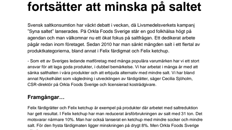 Svensk saltkonsumtion har väckt debatt i veckan, då Livsmedelsverkets kampanj ”Syna saltet” lanserades. På Orkla Foods Sverige står en god folkhälsa högt på agendan och man välkomnar nu ett ökat fokus på saltfrågan. Ett dedikerat arbete pågår redan inom företaget. Sedan 2010 har man sänkt mängden salt i ett flertal av produktkategorierna, bland annat i Felix färdigmat och Felix ketchup.