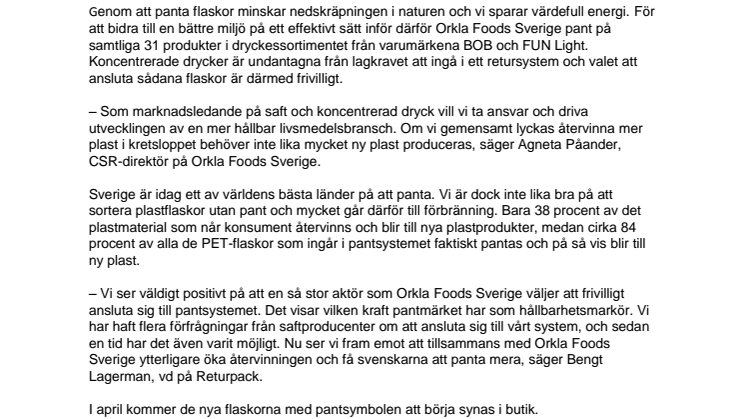 Som en del i sitt hållbarhetsarbete inför Orkla Foods Sverige nu pant på plastflaskor från storsäljarna BOB och FUN Light. ”Nu ser vi fram emot att tillsammans med Orkla Foods Sverige ytterligare öka återvinningen och få svenskarna att panta mera”, säger Bengt Lagerman, vd på Returpack.