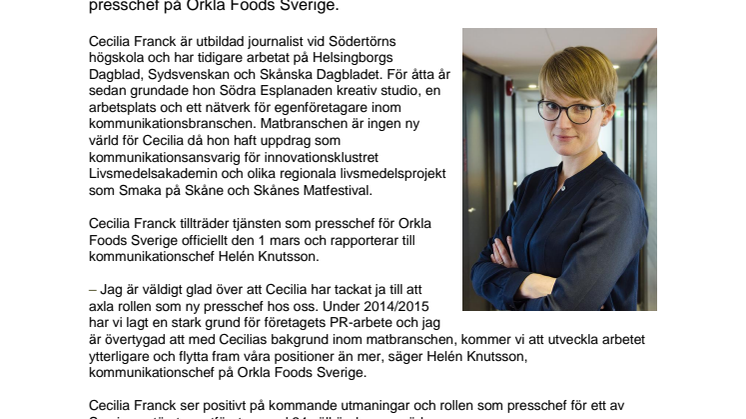 Cecilia Franck tillträder tjänsten som presschef för Orkla Foods Sverige officiellt den 1 mars och rapporterar till kommunikationschef Helén Knutsson.