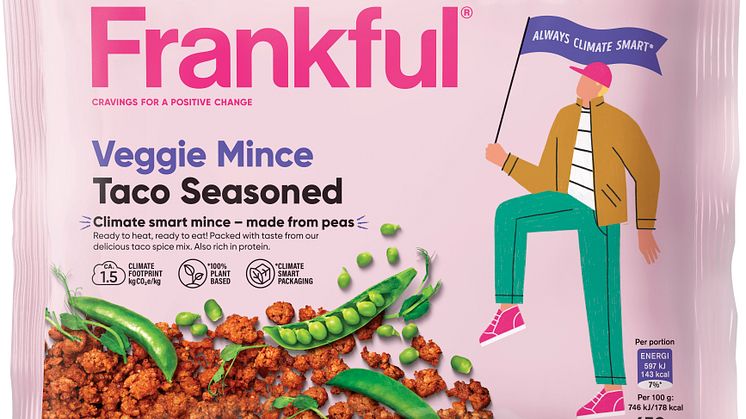 Bland de nya produkterna finns även något som allt fler efterfrågar idag: växtbaserade tacoalternativ. Frankfuls veganska rivna ”ost”, Vegan Grated Ch**se, är ett smakrikt alternativ som är baserat på kokosolja och som har 60% lägre klimatpåverkan än mjölkbaserad ost. På liknande sätt är en av juvelerna i kronan den färdigkryddade veganska färsen, Veggie Mince, ett proteinrikt alternativ gjort på protein från ärtor. Detta färsalternativ har upp till 95% lägre klimatavtryck än svensk nötfärs.
