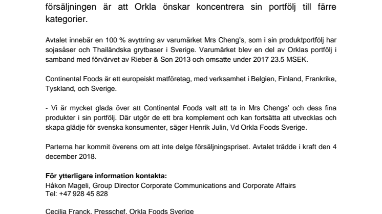 Orkla Foods Sverige har kommit överens och signerat ett avtal med Continental Foods om försäljning av varumärket Mrs Cheng’s. Syftet med försäljningen är att Orkla önskar koncentrera sin portfölj till färre kategorier.