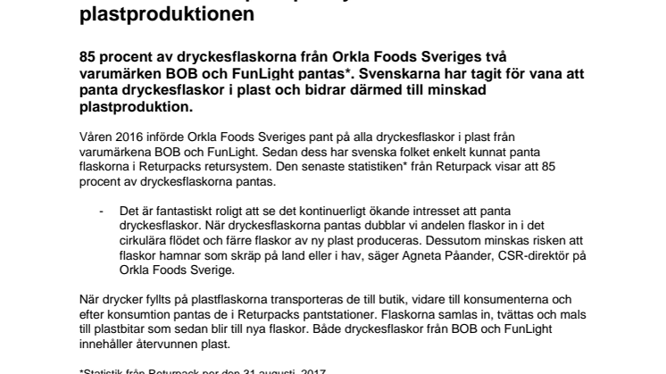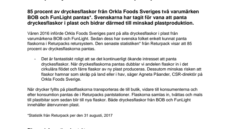 Våren 2016 införde Orkla Foods Sveriges pant på alla dryckesflaskor i plast från varumärkena BOB och FunLight. Sedan dess har svenska folket enkelt kunnat panta flaskorna i Returpacks retursystem. Den senaste statistiken* från Returpack visar att 85 procent av dryckesflaskorna pantas.