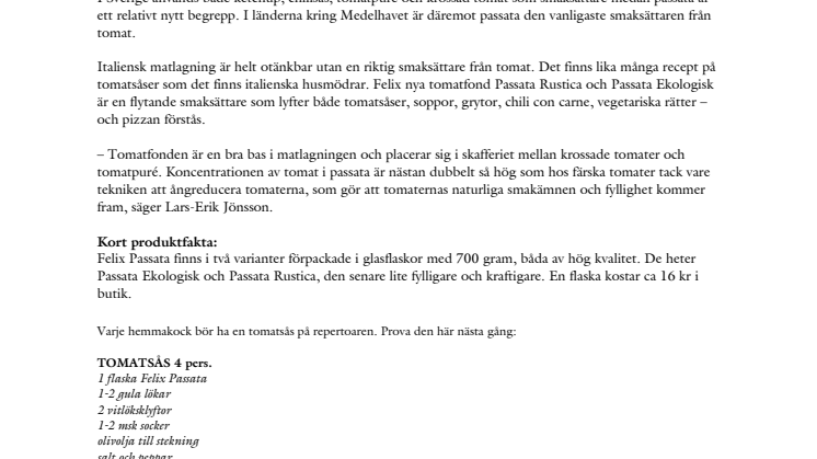 Italiensk matlagning är helt otänkbar utan en riktig smaksättare från tomat. Det finns lika många recept på tomatsåser som det finns italienska husmödrar. Felix nya tomatfond Passata Rustica och Passata Ekologisk är en flytande smaksättare som lyfter både tomatsåser, soppor, grytor, chili con carne, vegetariska rätter – och pizzan förstås.