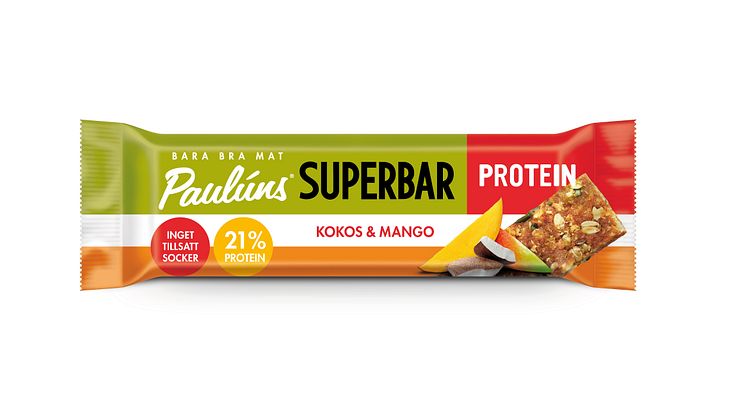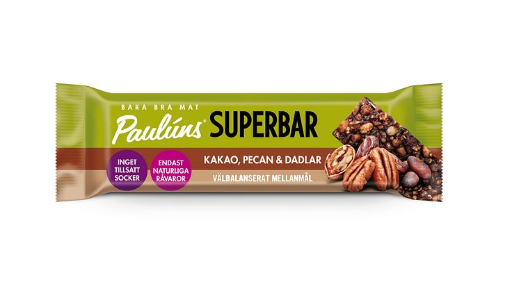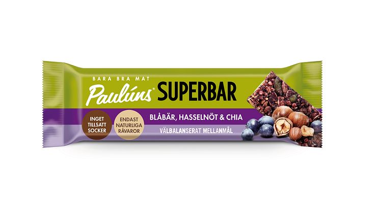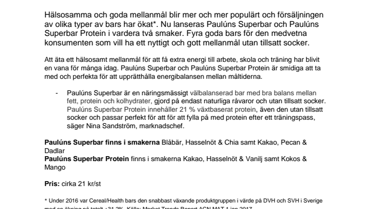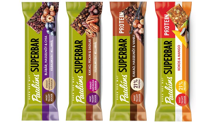 - Paulúns Superbar är en näringsmässigt välbalanserad bar med bra balans mellan fett, protein och kolhydrater, gjord på endast naturliga råvaror och utan tillsatt socker. Paulúns Superbar Protein innehåller 21 % växtbaserat protein, även den utan tillsatt socker och passar perfekt för att för att fylla på med protein efter ett träningspass, säger Nina Sandström, marknadschef.